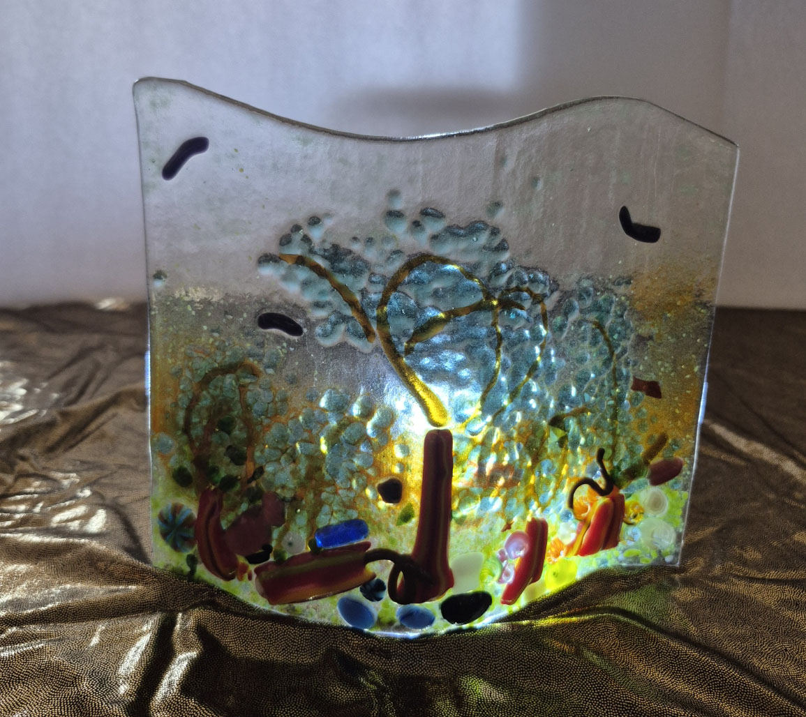 One of a kind fused glass candle votive 10″ x10″, hand made, USA company